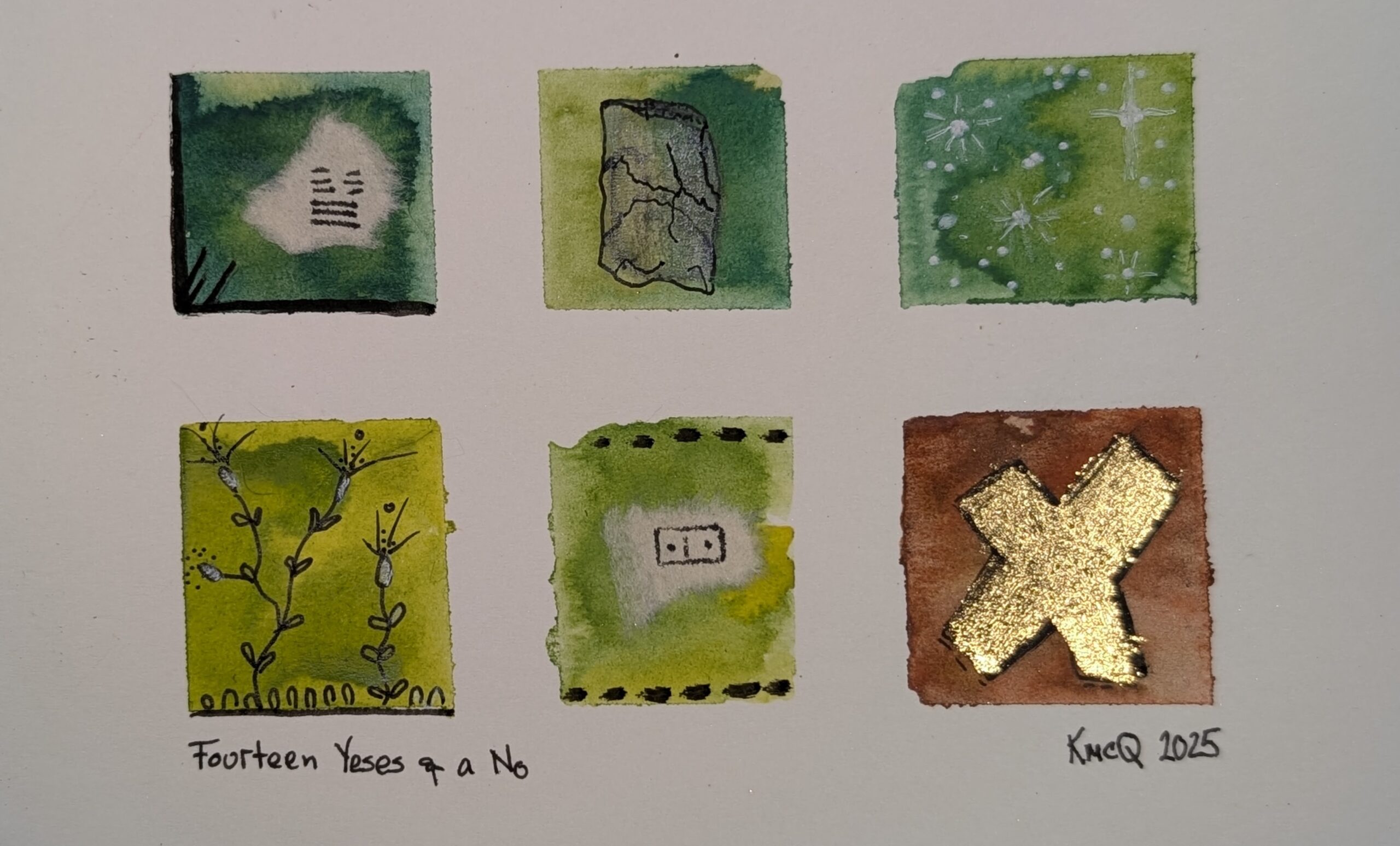 I was inspired to make this little watercolor collage that depicts a problem with divination: when earnestly petitioning for an answer, you may receive a YES many times over, but the answer you focus on is the single NO.