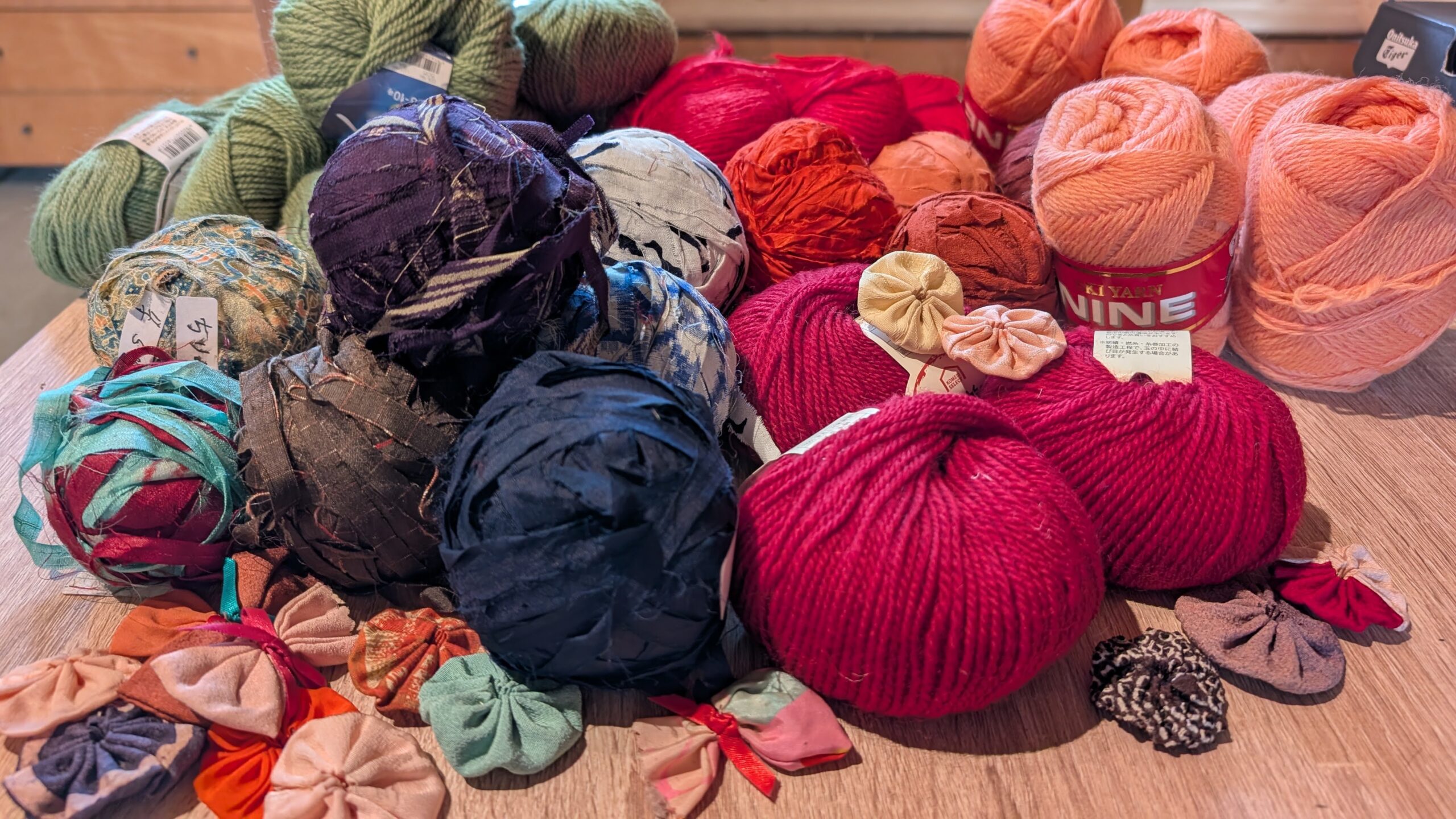 By the time I got there on the 20th, day before her show closed, all of her weavings had been sold, but Morita-san was also selling off her stash of supplies. I bought a dozen balls of sakiori, fabrics cut into thin strips for weaving, and twenty skeins of wool yarn in colors that I love. She gave me a handful of little extras. I regret that I didn’t buy more, however I will treasure these supplies and enjoy using them in my weavings with great pleasure.